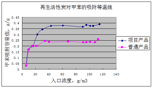 本產品主要是用特有工藝,促進活化過程中所需孔隙的形成,使活性炭產品的孔徑分布均勻,提高產品對甲苯氣體的選擇性,使產品對甲苯吸附性能大幅度提高。通過對甲苯的吸附脫附試驗以及客戶的實際使用情況得知,甲苯吸儲專用活性炭對甲苯吸附容量可達到450mg/g,再生吸附容量可達380mg/g。再生吸附率達到了84.4%。比普通活性炭有更佳的表現,大大提高甲苯的回收率和使用壽命。